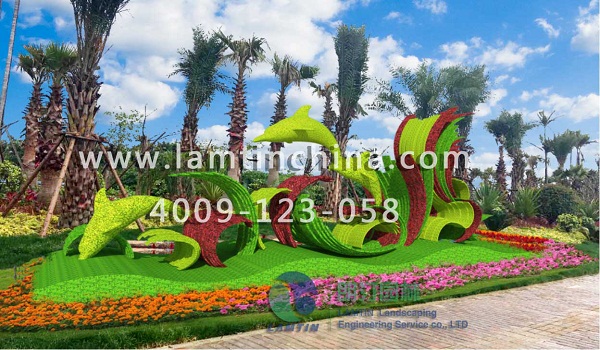 采用綠雕加地擺花的形式做道路節(jié)點綠化,以“歡騰”為主題的宣傳綠雕。融入廈門獨有的白海豚元素,寓意廈門這個美麗的海濱城市歡迎您。