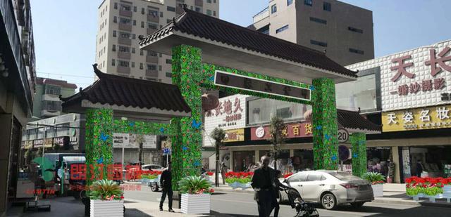 門樓綠化設(shè)計(jì):門樓是警民路的重要位置,為突出本街道的花街特色;我們采用植物對(duì)門樓的柱體和橫梁進(jìn)行綠化包裝,在每個(gè)柱子前放置一個(gè)歐式方形藝術(shù)花箱;使原本生硬的建筑體充滿生機(jī),并且給街道增添色彩。
