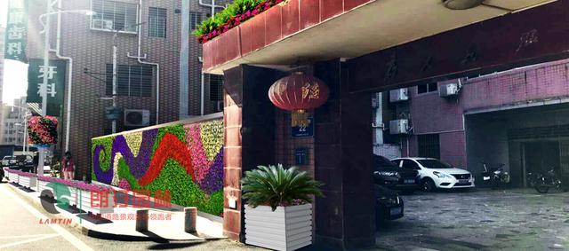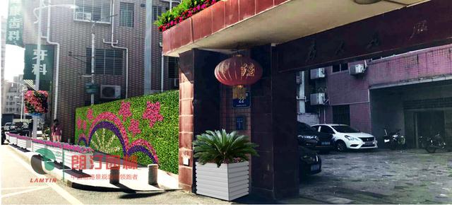 圍墻景觀提升:現(xiàn)場(chǎng)原圍墻墻體色彩單一,年代久遠(yuǎn);采用植物墻模塊式花盆(5012)對(duì)墻體進(jìn)行綠化包裝,從色彩上可以有多重選擇(見上圖),且具有很強(qiáng)烈的花街特色;為了迎合墻體綠化,在門樓頂部放置頂式花盆(8430)進(jìn)行頂部景觀提升,燈桿利用立體花柱進(jìn)行景觀提升,并且在門口放置兩個(gè)花箱。
