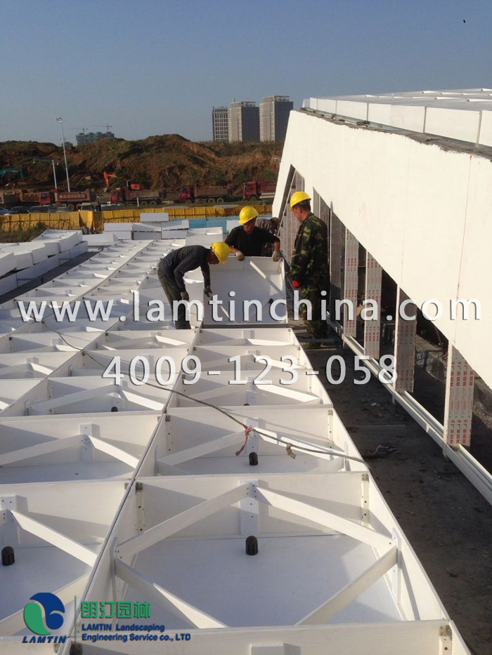 國慶期間,合肥高鐵南站工程在緊鑼密鼓的進行著,位于南站北面兩側(cè)的3000平方米的屋頂綠化方案由北京城建集團總設(shè)計師主導(dǎo)設(shè)計,整體屋頂呈高低起伏,具有大山層巒疊嶂之感。此次屋頂綠化方案的實施沒有采用以往的塑料花盆,蓄排水板,堆砌覆土等方式而是采用了PVC微發(fā)泡花箱的形式,朗汀在屋頂綠化領(lǐng)域的嘗試有了新的突破。