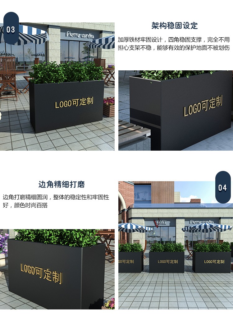 用途:商業(yè)店鋪廣告花箱,隔離花箱,人行道隔離花箱,工業(yè)園區(qū)隔離花箱,商業(yè)街區(qū)隔離花箱,咖啡店隔離花箱